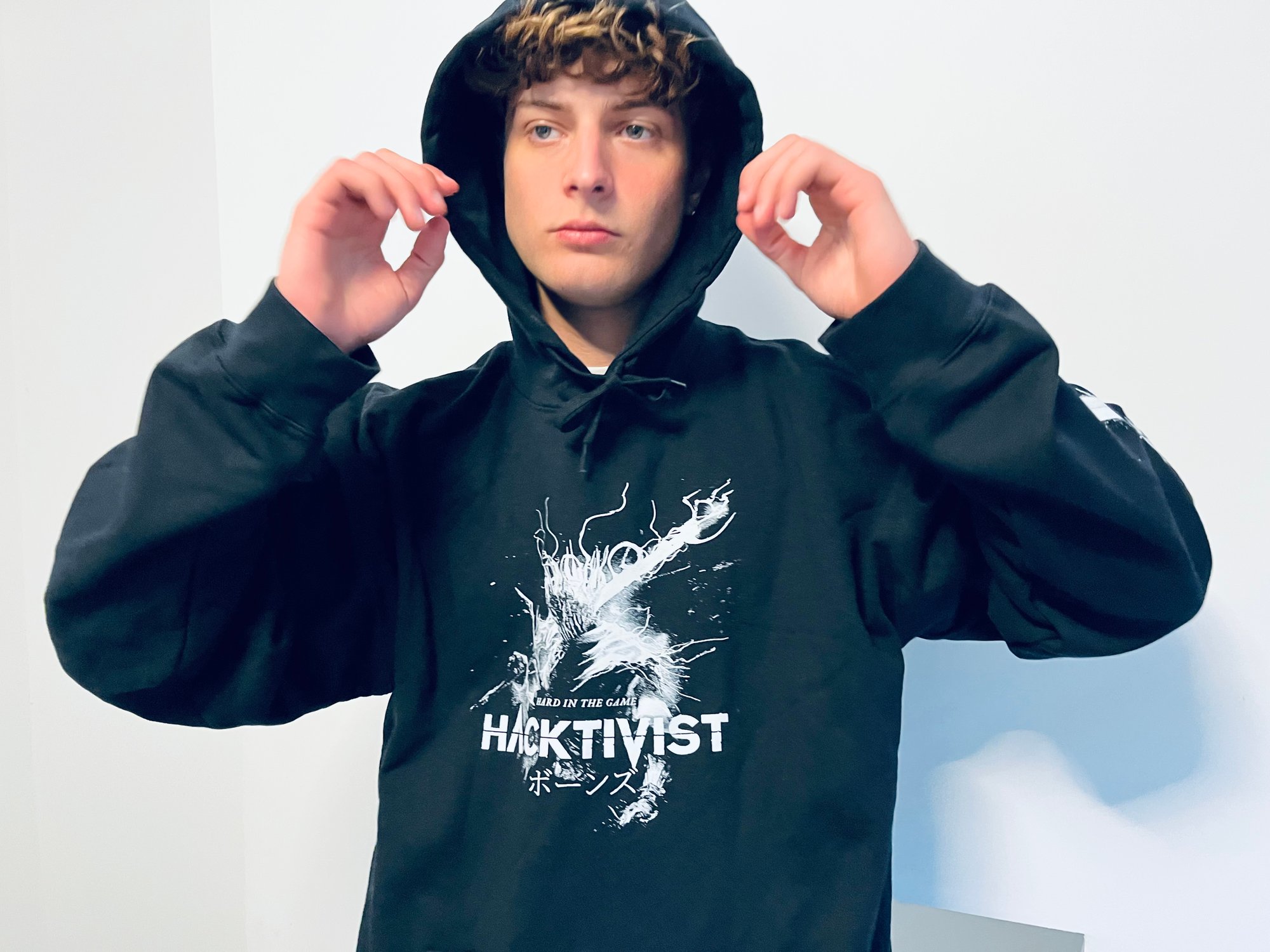 Black Cotten hoodie with screen printed logo on front and swords on sleeves