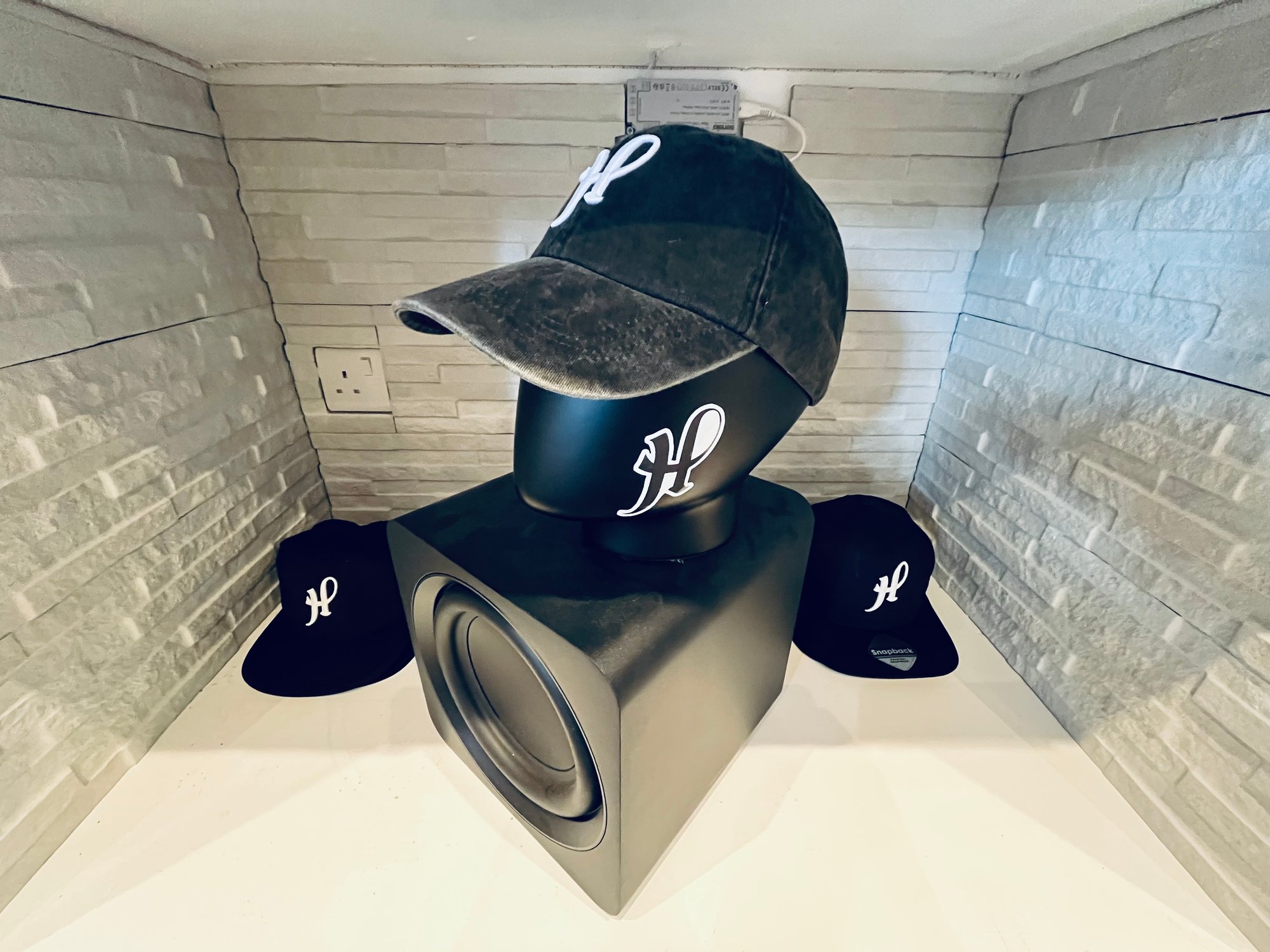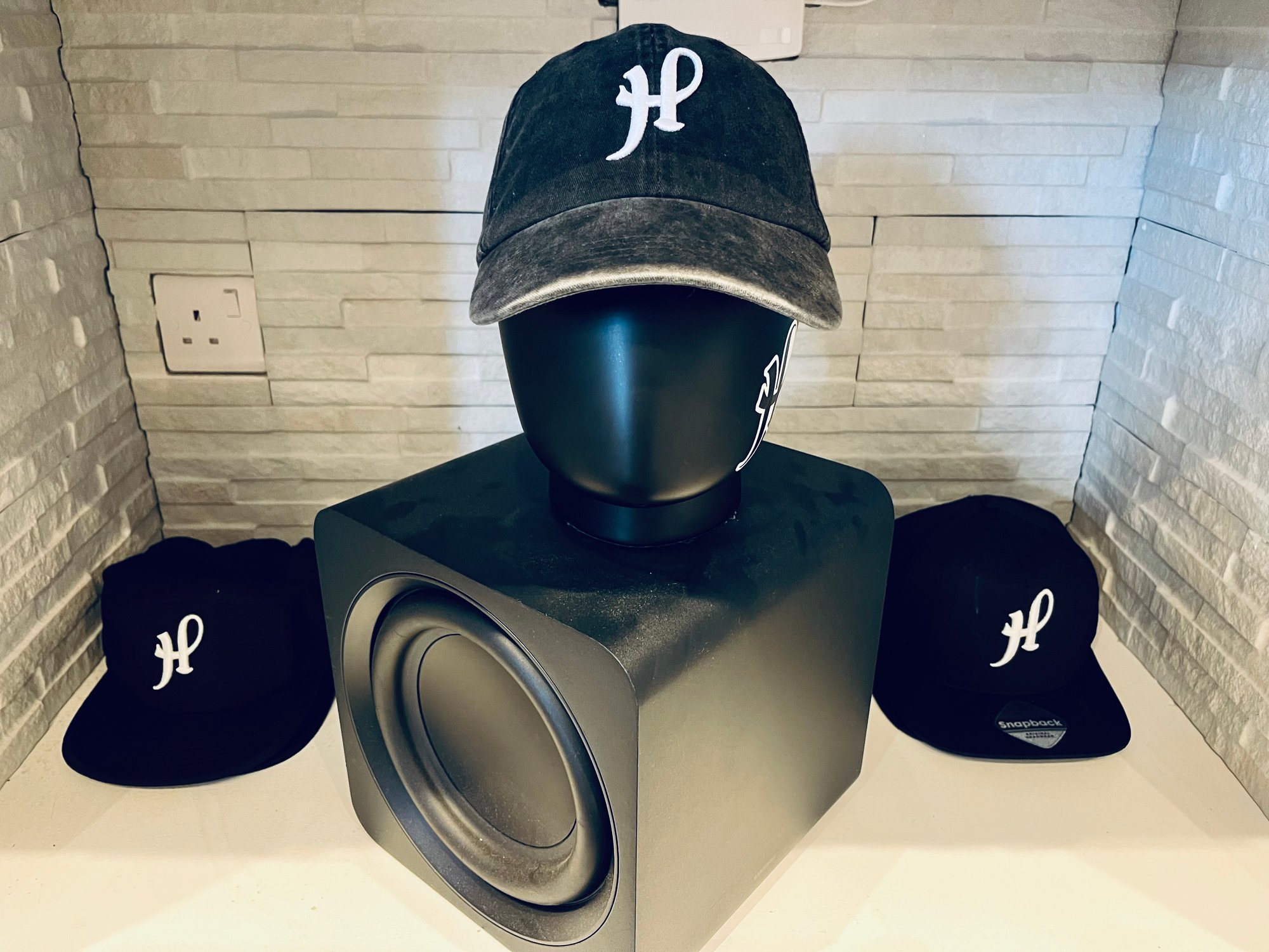 Black stone washed 3d embroidered H on front with hacktivist logo embroidered on back